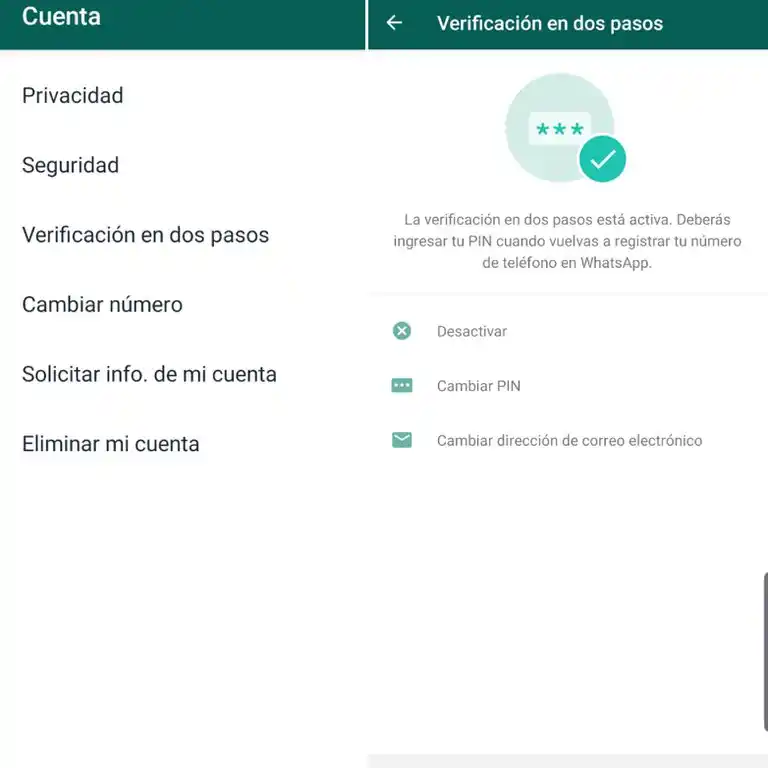 - Activar la verificación en dos pasos ingresando a WhatsApp en en la sección “Cuenta”, ubicada dentro de la sección “Ajustes” o “Configuración” -dependiendo del modelo de dispositivo. Cuando se activa esta opción, cada vez que se busque verificar la cuenta de WhatsApp en algún nuevo dispositivo, se solicitará esa clave. Activar esta opción te protegerá, también ante futuros ataques. Es importante que, al configurar la verificación en dos pasos, ingreses también una dirección de correo electrónico para que no se bloquee la cuenta si te olvidás tu número de PIN.