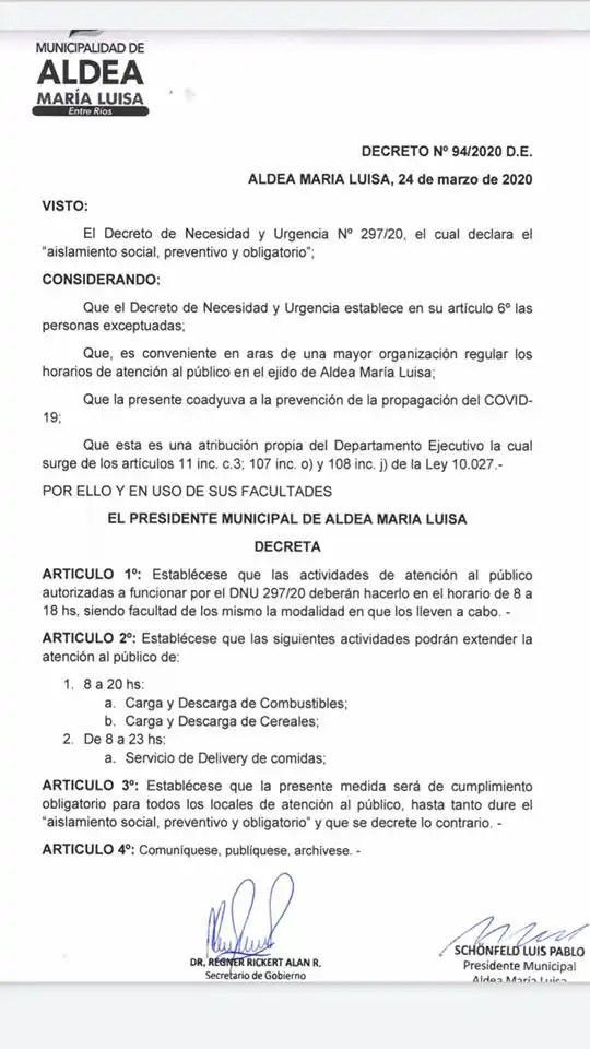 Por medio del decreto Nº 94/2020 con fecha 24 de marzo, el municipio de María Luisa estableció en el artículo 1ro que las actividades de atención al público autorizadas a funcionar por el DNU 297/20 deberán hacerlo en el horario de 08:00 a 18:00 horas. Mientras que el artículo 2do establece los rubros que podrán extender los horarios de atención al público, disponiéndose que de 8:00 a 23:00 sea el horario habilitado diariamente para el reparto a domicilio de alimentos, medicamentos, productos de higiene, de limpieza y otros insumos de necesidad. Mientras que de 08:00 a 20:00 sea la atención para carga y descarga de cereales y combustibles.