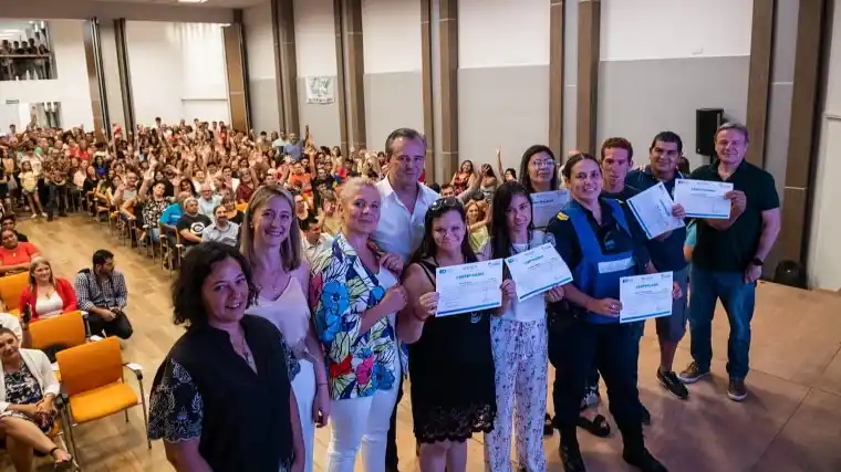Durante la ceremonia, desarrollada en el salón del Sindicato de Empleados de Comercio, recibieron sus certificados 249 vecinos y vecinas que se capacitaron en albañilería, construcción en seco, electricidad, panadería, herrería y trabajo textil, entre otros oficios.