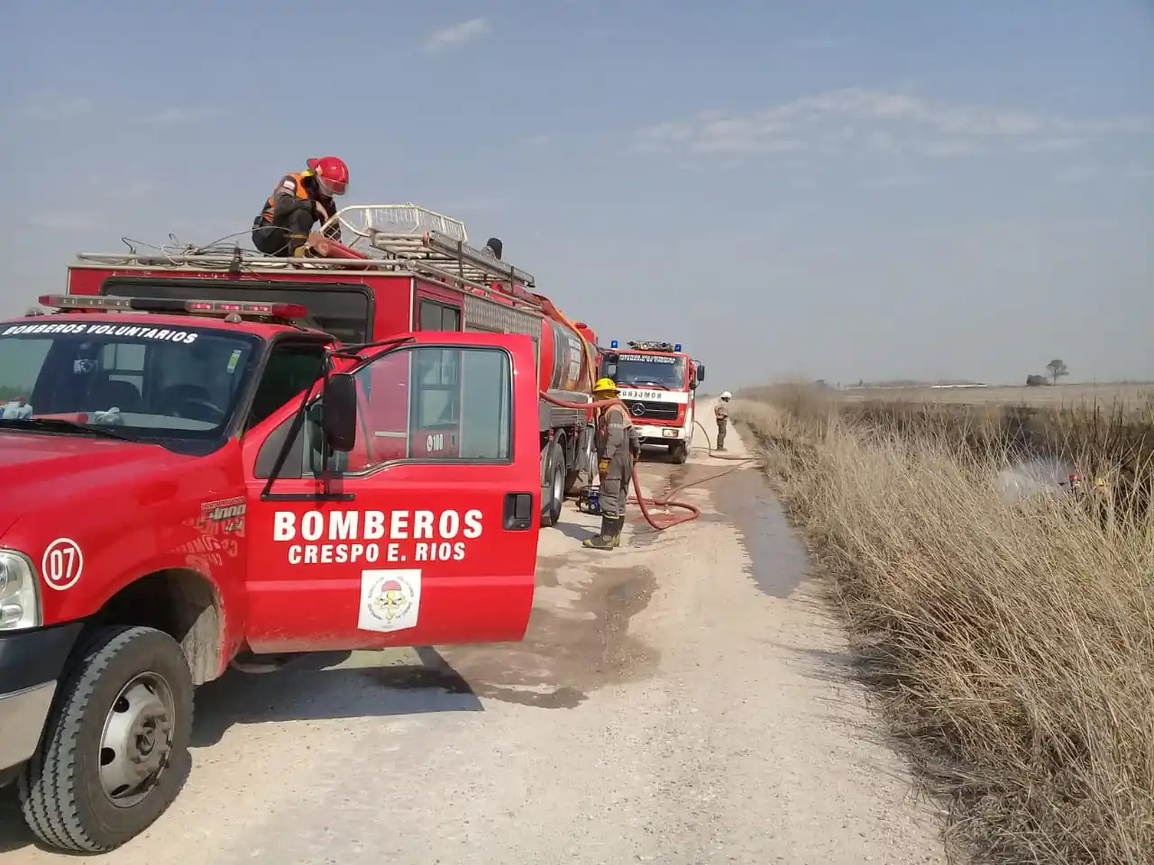 Crespo.- Desde las 13.00 hasta las 15:00 horas, 2 autobombas junto a un camión cisterna y ocho integrantes del cuerpo de bomberos, trabajó en extinguir un incendio forestal en la zona de banquina del camino a Aldea San Rafael.