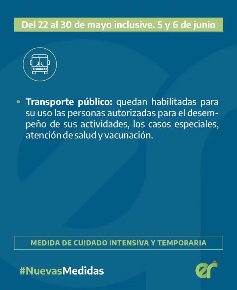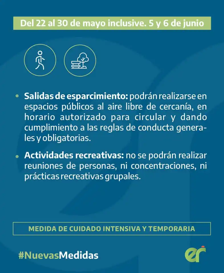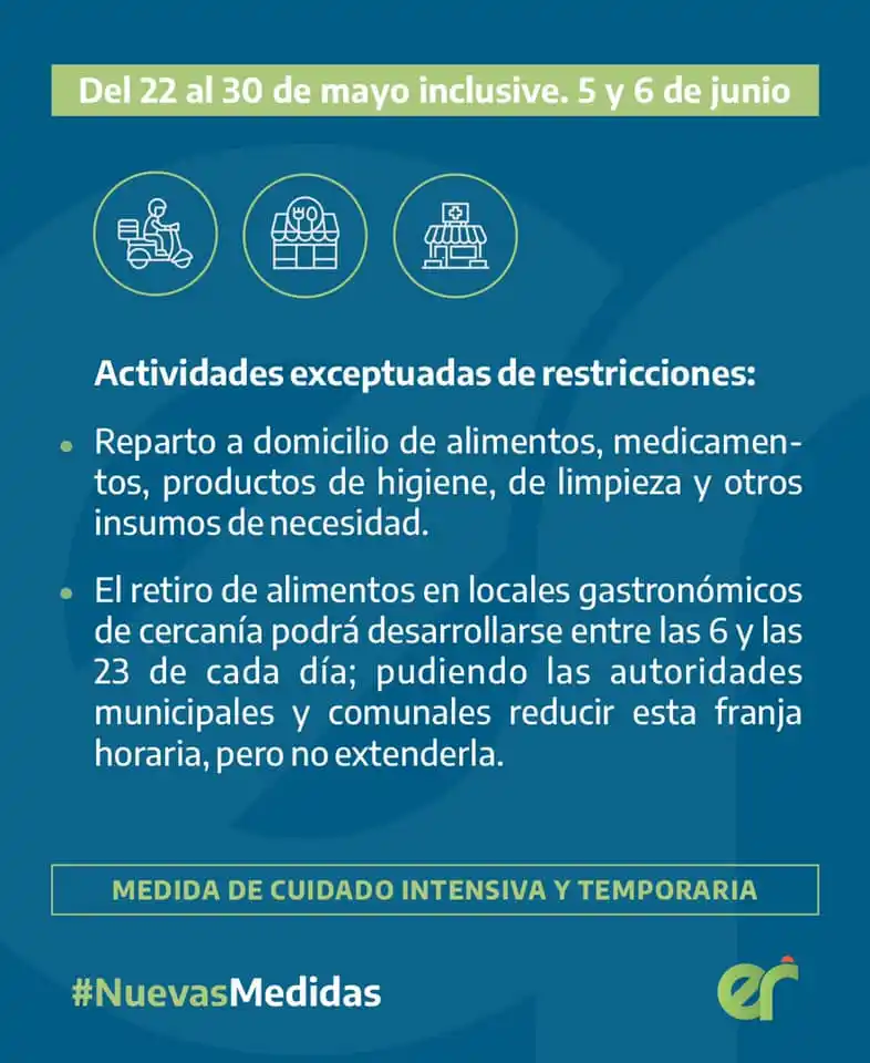 En el marco de la estrategia conjunta nacional para reducir los contagios de Coronavirus, Entre Ríos publicó el decreto N 1115 que adhiere “a todas las medidas dispuestas por el Decreto de Necesidad y Urgencia Nº 334/21 del Poder Ejecutivo Nacional”. Rige hasta el 30 de mayo inclusive y 5 y 6 de junio.