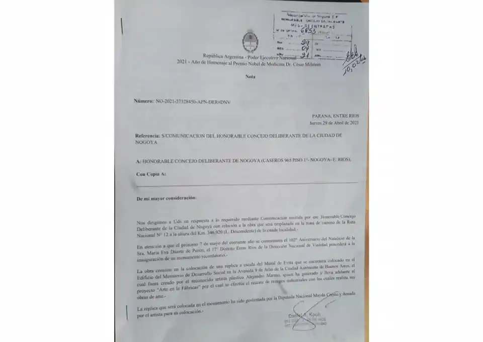 “Me debo a mis vecinos y a ellos les informo que el señor Koch se acercó a mi despacho y me manifestó que iba a colocar un busto de Eva Duarte. Le manifesté mi rotunda negación al mismo por cuanto entendía que habíamos pedido un espacio para poner las letras de Nogoyá y se me contestó que no, porque no estaba permitido realizar montajes u obstáculos a la vera de los caminos”, comenzó explicando el intendente.