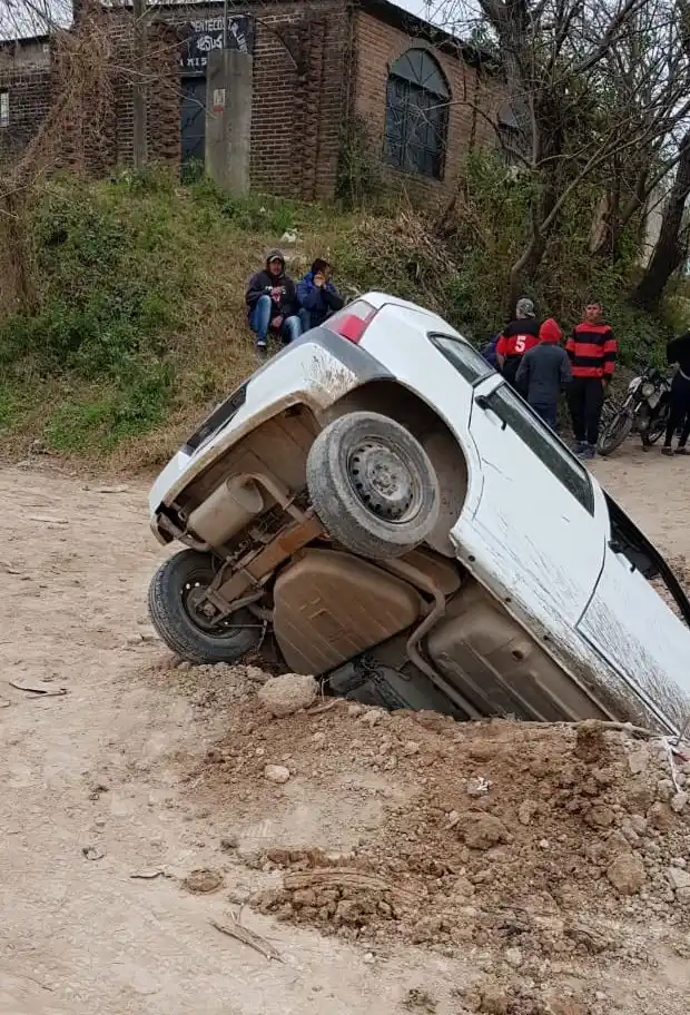 Victoria.- Un Fiat Uno quedó incrustado en un profundo pozo en la esquina de Garay y Rondeau este domingo 8 de septiembre en horas de la tarde.