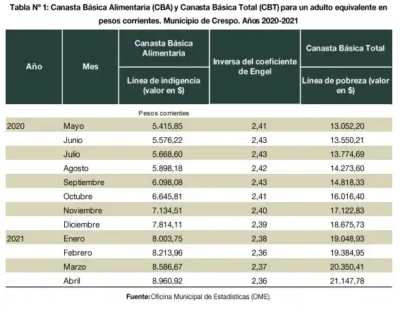 El estudio que realiza mensualmente la Oficina Municipal de Estadística de Crespo, siguiendo la metodología del Indec, al trazar el umbral de la indigencia en base a una ingesta mínima de alimentos seleccionados en función de los hábitos de consumo de la población, según la Encuesta Nacional de Gastos de los Hogares (ENGHo) 1996/97, al precio más bajo, determinó para abril $ 8.960,92 para un adulto entre 30 y 60 años.