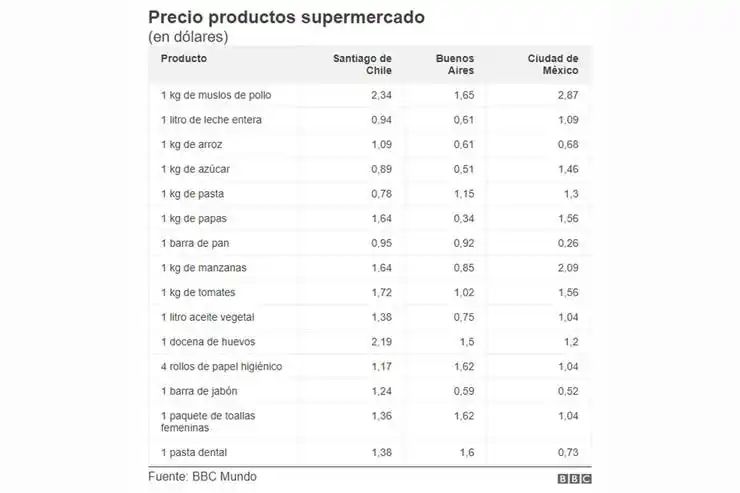 Con información suministrada por los corresponsales de BBC Mundo, seleccionamos algunos de los productos más comunes en la cesta de la compra en Santiago, Buenos Aires y Ciudad de México.