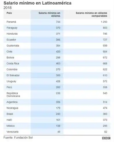 La siguiente tabla incluye los sueldos mínimos en América Latina en 2018, expresados en dólares. El más alto es el que se paga en Panamá, seguido por los de Costa Rica, Uruguay, Chile y Ecuador.