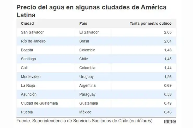 La Superintendencia de Servicios Sanitarios de Chile hizo un estudio comparativo de la tarifa por metro cúbico del agua potable y saneamiento en 2017 en algunas urbes del mundo.