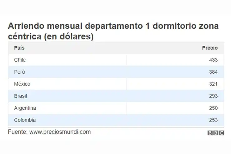 Al comparar el costo de alquilar un departamento de una habitación en una zona céntrica, el valor más alto se da en Chile, seguido de Perú y México, según datos de la página web Preciosmundi.