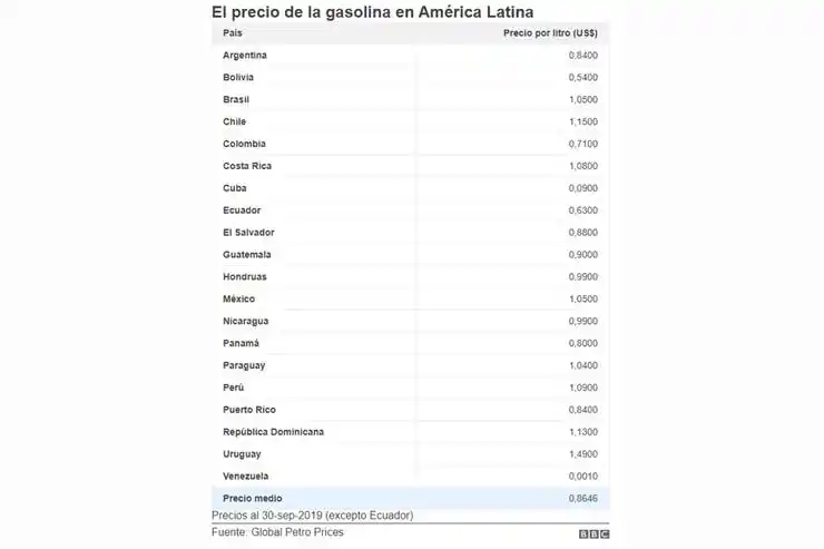El precio medio del combustible regular en América Latina ronda los US$0,86 por litro, según el índice Global Petro Prices con datos del 30 de septiembre de 2019.