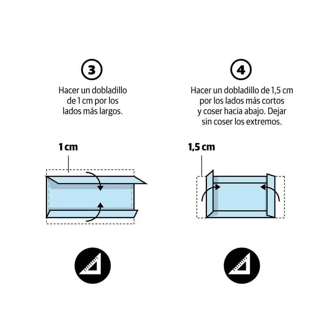 -Doblá sobre los lados largos 1 cm y hacé el dobladillo. Luego doblá la doble capa de tela sobre 1,5 cm a lo largo de los lados cortos y cosé hacia abajo.