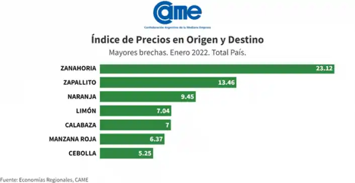 El Índice de precios en Origen y Destino (IPOD), que elabora mensualmente la Confederación Argentina de la Mediana Empresa (CAME), reveló que los consumidores pagaron en promedio 3,45 veces más de lo que cobraron los productores, por lo que la brecha se redujo 7,2% en enero.