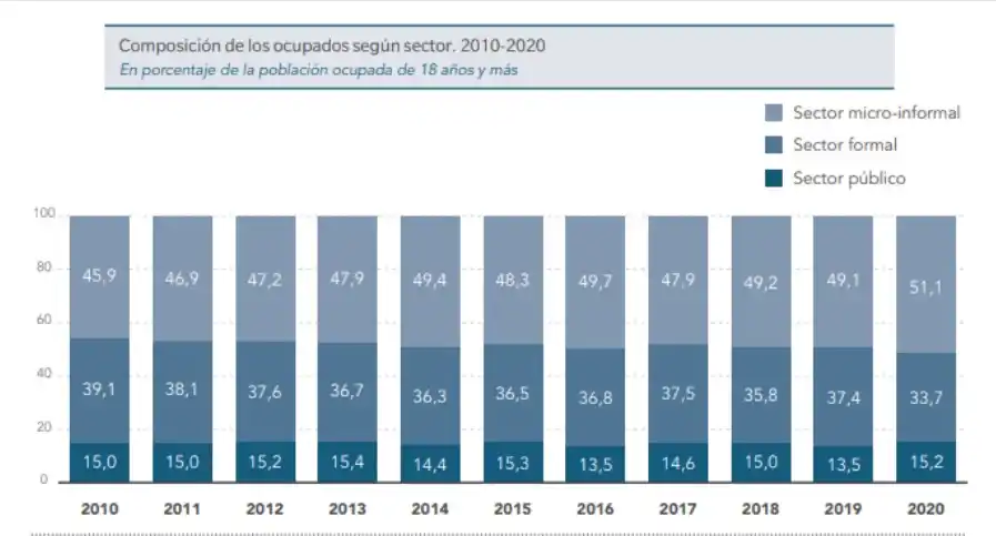 - Los trabajadores que se desempeñan en la microinformalidad alcanzaron al 51,1% del total y por primera vez fueron la mayoría del mercado laboral. Los trabajadores del sector publico representaron el 15,2% y quienes se desenvolvieron en el sector privado formal el 33,7%.