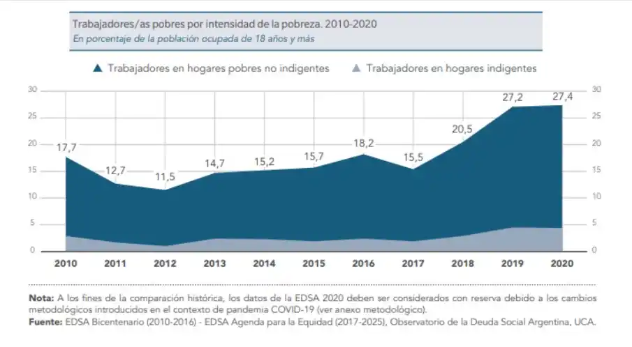 El análisis realizado por Eduardo Donza y Santiago Poy y coordinador por Agustín Salvia mostró una significativa suba de los niveles de pobreza medido exclusivamente entre las personas con trabajo, que del 15,5% en 2017 trepó al 27,4% en 2020, con una suba de 11,9 puntos porcentuales.