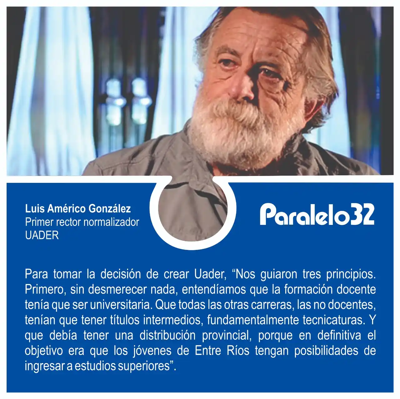Entre Ríos (APFDigital).- Este lunes 8 de junio se cumplieron 20 años de la promulgación de la Ley Provincial N° 9250, mediante la cual se impulsó la creación de la Universidad Autónoma de Entre Ríos (Uader). “Siento emoción y alegría de que la institución siga”, subrayó Luis Américo González, su primer rector normalizador desde el año 2000 al 2003. “Después podemos opinar si tiene que ir para un lado o para el otro, pero son matices. Hoy lo importante es que siga abierta y, sobre todo, con un alto número de alumnos, que son los jóvenes que no están en la calle”, resaltó.