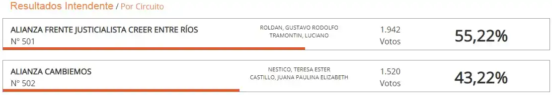 5. Ibicuy, Gustavo Roldán (Creer), derrotó a Teresa Néstico (Cambiemos)