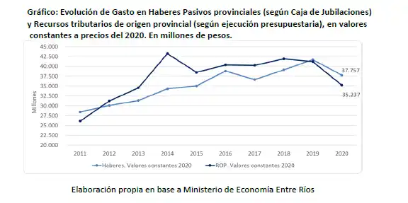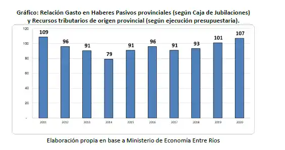 En 2020, por cada 100 pesos que se recaudaron por el cobro de impuestos de origen provincial a la actividad privada, se destinaron 107 al pago de haberes previsionales, jubilaciones y pensiones del sistema provincial. “Este indicador presenta una tendencia creciente desde el 2014 que se acelera en los últimos 2 ejercicios”, subraya el trabajo.