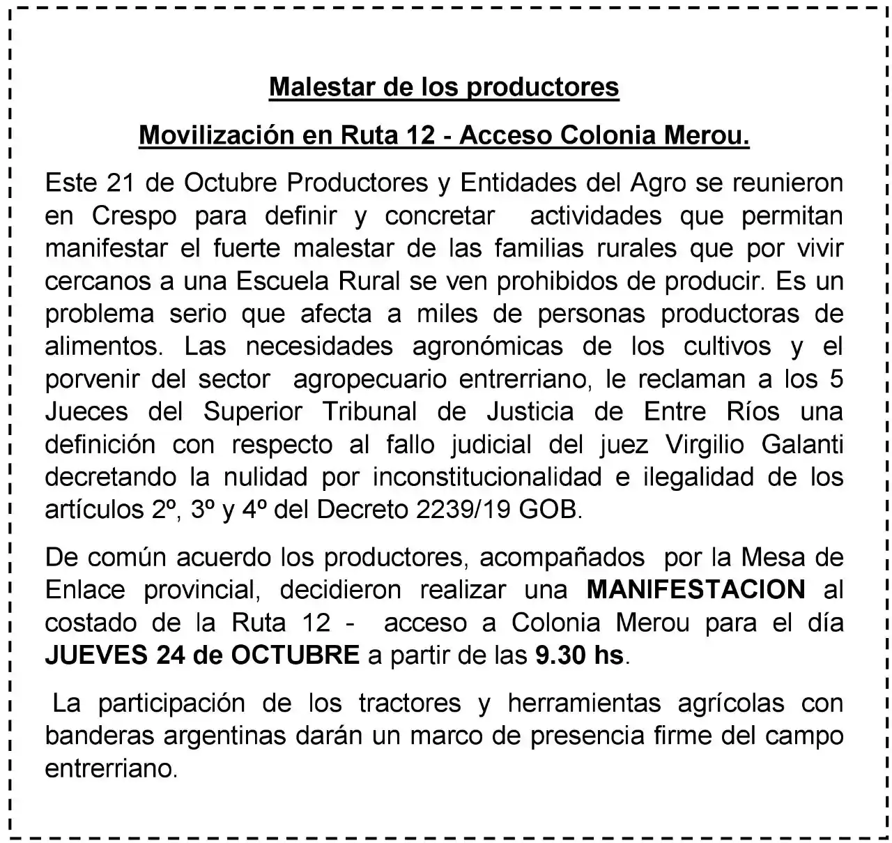 Según el comunicado enviado a Paralelo 32 desde la entidad, habrá una manifestación desde las 9.30 en la Ruta 12, más precisamente en el acceso a colonia Merou con tractores, herramientas agrícolas y camiones debido «al extenso tiempo que se están tomando los jueces del Superior Tribunal de Justicia de Entre Ríos con respecto al fallo judicial que el juez, Virgilio Galanti decretó la nulidad por inconstitucionalidad e ilegalidad de los artículos 2º, 3º y 4º del Decreto 2239/19 GOB, y de las restantes normas que en el mismo y en su Anexo, importen reglamentación y/o aplicación de los artículos cuya inconstitucionalidad aquí se dispone».