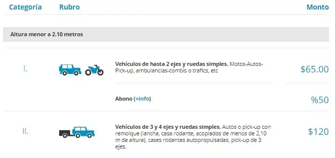 En tal sentido, para la categoría I, que representa el 80 por ciento de los vehículos que circulan a diario por el viaducto interprovincial (motos, autos, camionetas y combis), la actualización será del orden de 10 pesos; por lo que el cruce para la Categoría I pasará a costar 65 pesos, mientras que los usuarios de ese segmento que circulen regularmente por dicha conexión y dispongan de la tarjeta de abono abonarán la mitad de ese valor, es decir $32,50.