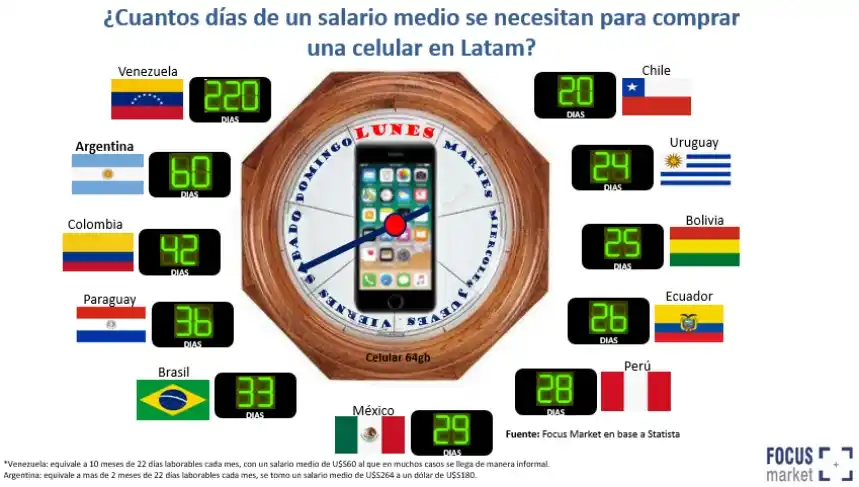 La brecha se amplía en el caso de un celular de 64 GB, para cuya compra un argentino debe trabajar 60 días contra 220 de un venezolano pero 36 de un paraguayo, 33 de un brasileño, 25 de un boliviano, 24 de un uruguayo o 20 de un chileno.