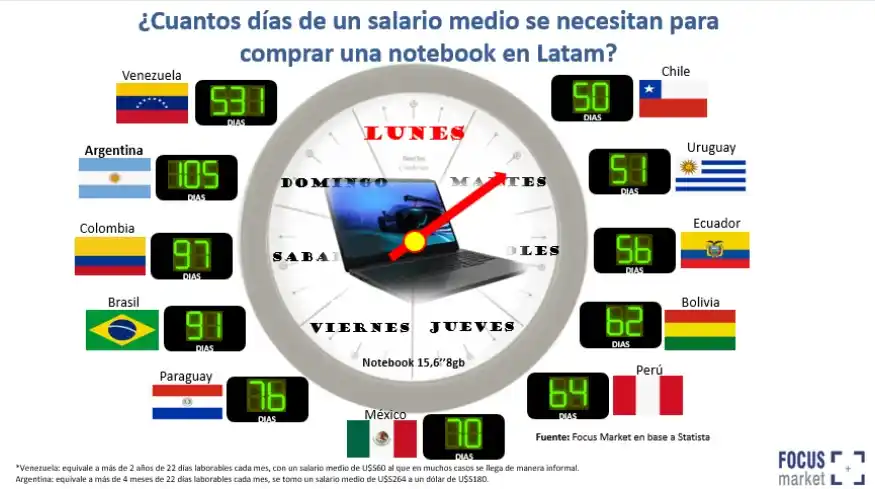 La entidad comprobó que un argentino necesita trabajar 105 días para comprar una notebook de 15,6 pulgadas, mucho menos que los 531 días requeridos en Venezuela, pero más que los 91 días necesarios en Brasil, 76 en Paraguay, 62 en Bolivia, 51 en Uruguay y 50 días en Chile.