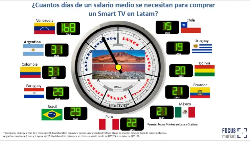 La situación es similar en el caso de un Smart TV de 43 pulgadas, para los que en el país se requieren 31 días de trabajo. Nuevamente, el trabajador argentino sólo está en mejores condiciones que el de Venezuela, que necesita 168 días, pero en peor situación que el resto de la región, ya que son necesarios 29 días de trabajo en Brasil o Paraguay, 22 días en Perú, 21 en México o Ecuador, 20 en Bolivia, 19 en Uruguay y 15 en Chile.