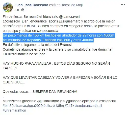El ultramaratonista crespense, Juan José Coassolo, que desde el jueves se encontraba participando de la ultramaratón de Sao Jao da Boa Vista (Brasil), junto al argentino Juan A. Craveri, y el español Marc Siques; con la asistencia técnica del crespense Juan Pablo Pittavino; y Juliano Isidoro; publicó en sus redes sociales que en esta oportunidad, con un poco menos de 150 kilometros recorridos en alrededor de 29 horas, con 4.000 metros acumulados de trepadas, y faltando casi 80 kilómetros y otros 4.000 metros de trepadas; pusieron fin a su participación en la que es considerada la carrera a pie más difícil en Brasil, donde se corre en el segmento más difícil y desafiante del Caminho da Fé (Camino de Fe o Camino de Fe), el camino de peregrinación brasileño más difícil.