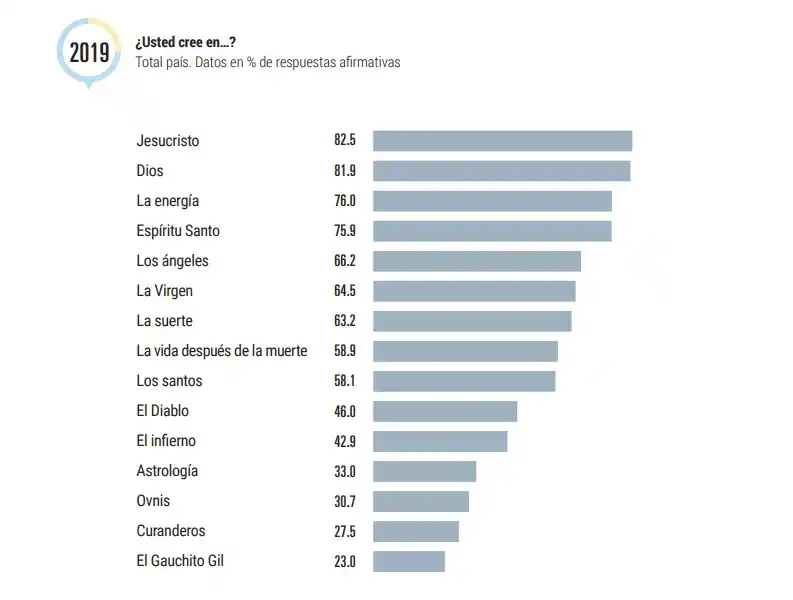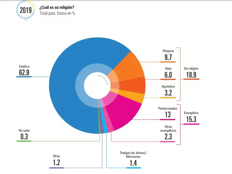 Los resultados fueron presentados esta mañana por Fortunato Mallimaci, director de la investigación que ya se había realizado en 2008. En síntesis: hay menos argentinos que dicen ser católicos (62,9%), los que declaran no creer (18,9%) son el segundo grupo más importante en el mapa de las religiones y los evangélicos (15,3%) son el grupo religioso que más creció en estos once años. Paralelamente, el 82% de los argentinos dice que cree en «Jesucristo» y un 76% en «la energía». El 60% afirmó que no lee la Biblia o el libro sagrado de su culto