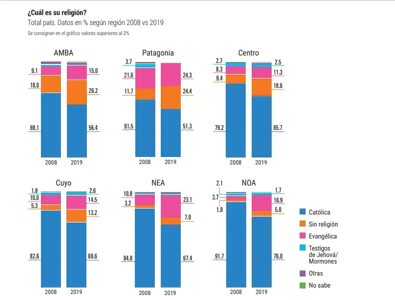 En cuanto a la formación académica, entre aquellos que sólo tienen estudios primarios hay mayoría de evangélicos, entre los que tienen estudios secundarios, los católicos, y entre los universitarios y profesionales, son mayoría los que no creen en Dios. La presencia de evangélicos se hace más evidente en todo el país en esta medición. Incluso en regiones como el Noroeste donde la tradición católica era mayoría. También allí creció el grupo de los que no creen en nada. Y en la Patagonia, la mitad de la población dijo no ser católica.