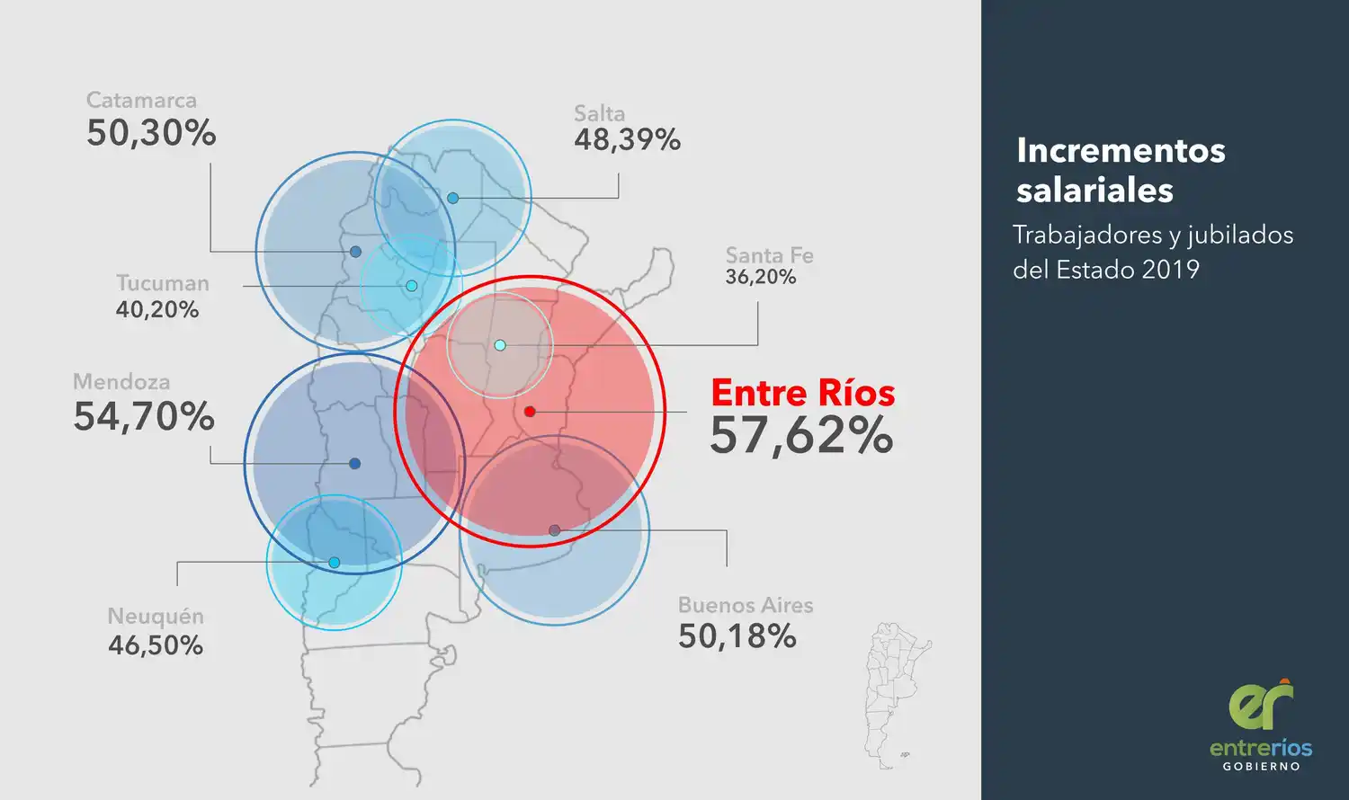 Cumpliendo con el compromiso asumido en paritarias, el gobierno entrerriano otorgó a los activos y pasivos del Estado un 57.62 por ciento de aumento en orden a la inflación en 2019, siendo unas de las provincias de mayor aumento al sector.