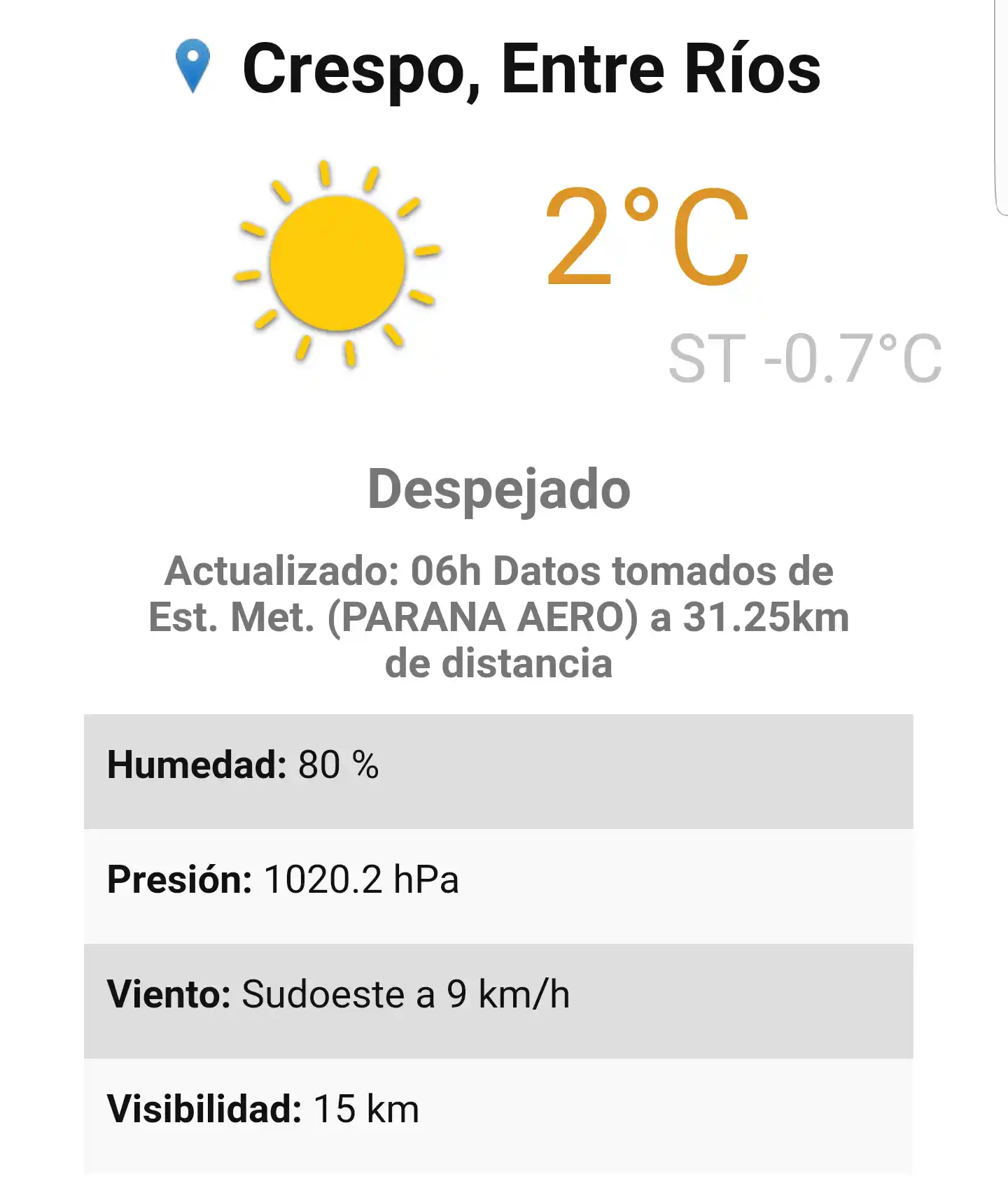 Mientras tanto, más hacia el sur del territorio entrerriano, como es el caso de Victoria, El Servicio Meteorológico Nacional daba cuenta de que había cero grado y una térmica de dos grados bajo cero.