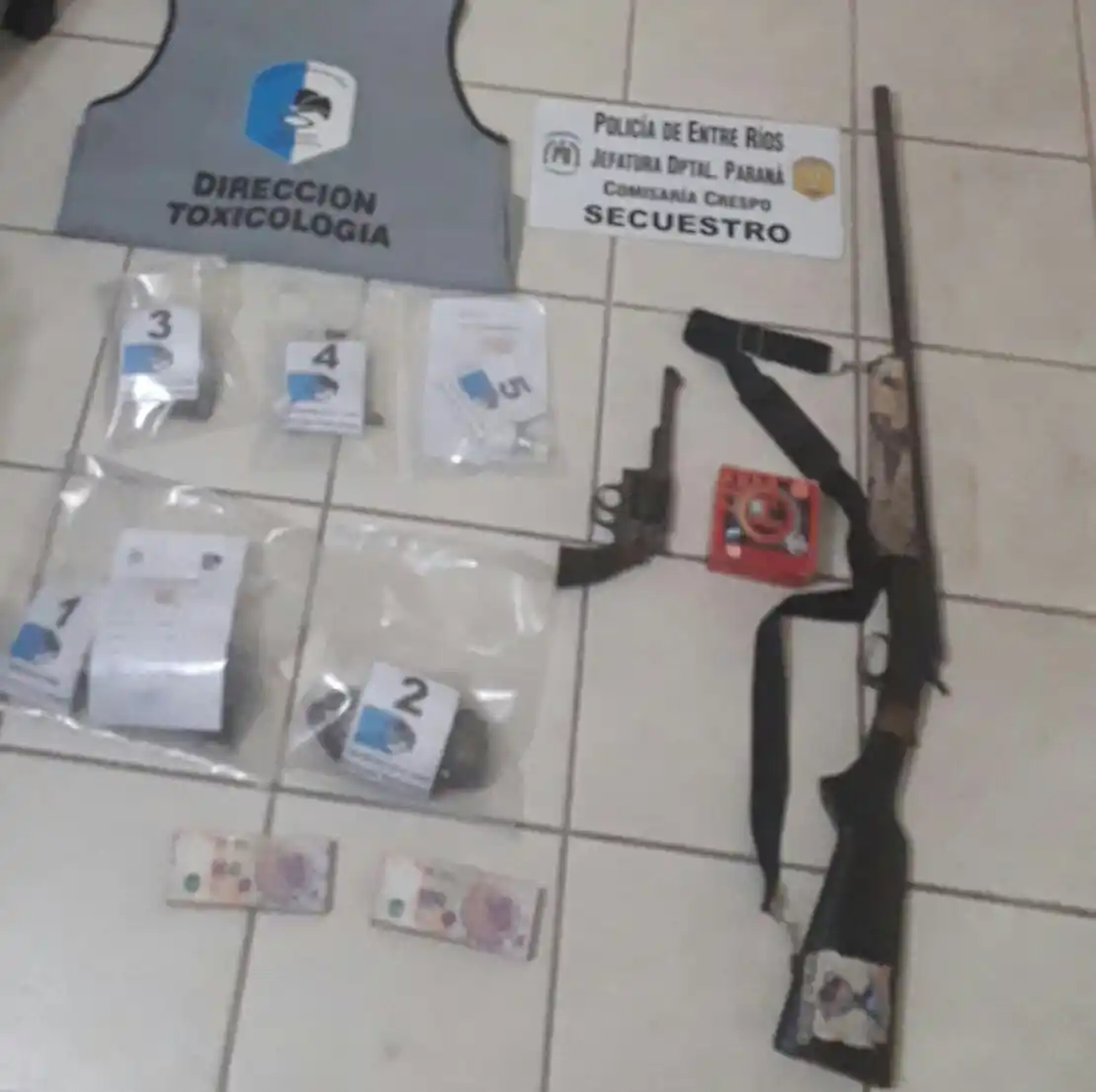 Tras ser notificado el morador, un hombre de 66 años de edad, «se procedió a una exhaustiva búsqueda, que culminó con el secuestro de: un revólver calibre .38, con cuatro cartuchos del mismo calibre; una escopeta calibre .12, con nueve cartuchos que le pertenecen; una importante suma de dinero, de la que el propietario no pudo acreditar el origen de los fondos; y cuatro bolsas conteniendo una sustancia vegetal presumiblemente estupefacientes, como así también una sustancia líquida de similares particularidades».