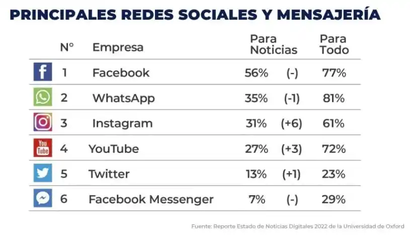 Por un lado, el celular sigue ocupando un lugar de privilegio entre los dispositivos de entrada de información (75%). Y por otro, las plataformas que siguen encabezando el ranking corresponden a Facebook y WhatsApp, dependientes del cada vez más poderoso Meta, el grupo corporativo de Mark Zuckerberg.