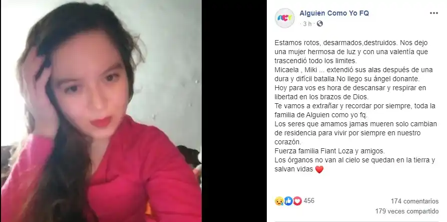 «El estado de Micaela es grave, pedimos que nos unamos en oración y roguemos en nuestras intenciones por ella», habían expresado el pasado sábado 14 desde Alguien Como Yo FQ; la ONG que en Entre Ríos trabaja para concientizar sobre la fibrosis quística, informando en forma permanente sobre la enfermedad, en qué consiste, cómo se puede trabajar en difundir y la importancia de la concientización sobre la donación de órganos.