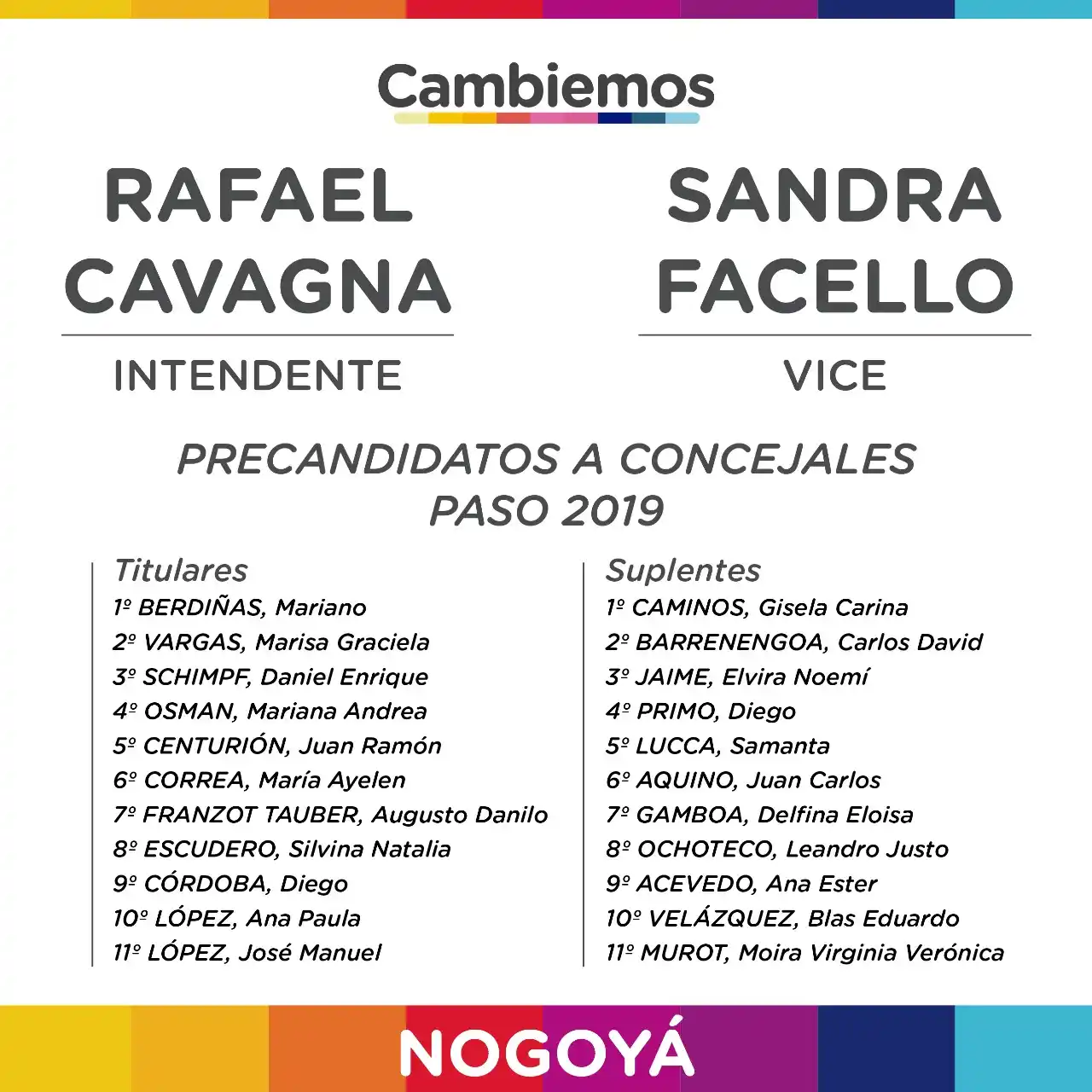 Los dos pre candidatos de Cambiemos sellaron acuerdo en las últimas horas. Una reunión con el Ministro del Interior Rogelio Frigerio habría sido determinante para que ambos dirigentes limen diferencias y encaren un proyecto conjunto. Rafael Cavagna repetirá fórmula con Sandra Facello como pre candidata a vice intendente. Mediante comunicación con Paralelo 32, el actual intendente de Nogoyá no pudo confirmar las listas de concejales que integrarán la fórmula debido a que se mantienen charlas con diferentes sectores, incluso Cavagna adelantó que a última hora del sábado estarán concurriendo a la junta electoral. Versiones indican que el PRO tendrá presencia legislativa con tres concejales en lugares preponderantes.