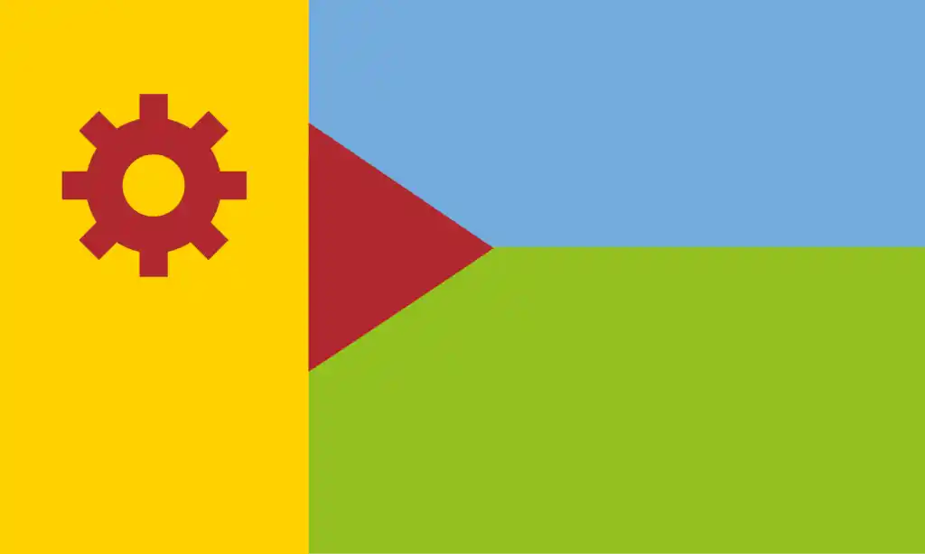 Modelo 2: El espacio vertical con el color amarillo del sol, el huevo, la energía y el optimismo, se transforma en un pollito con un engranaje como ojo; al combinarlo con el triángulo rojo que hace forma de pico, para transmitir con esos colores energía, pasión y dinamismo; simbolizando la avicultura y la industria como motores del progreso de nuestra ciudad. Este diseño además, consta de dos franjas horizontales con los colores celeste, en el cielo y en las banderas de Argentina y Entre Ríos; y verde, representando una ciudad amigable con el ambiente, con espacios al aire libre para parques y paseos, y también la relación con el campo y la esperanza.