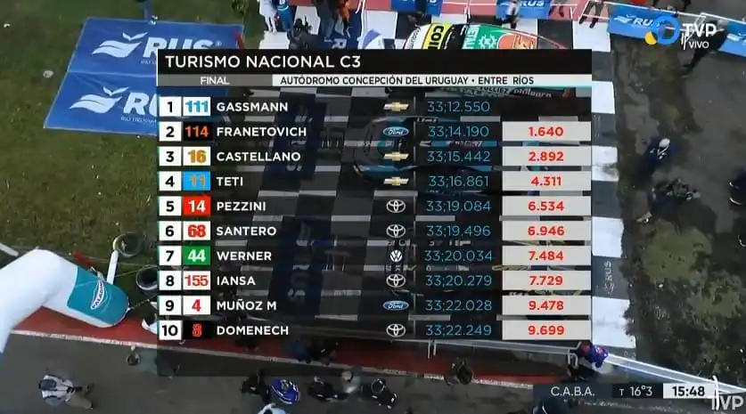 Gassman consiguió prevalecer en una competencia en la cual solo perdió el liderazgo por una vuelta ante Ever Franetovich, quien pudo quebrar la línea del entrerriano en el segundo giro, pero debió reubicarse detrás ante la advertencia que tuvo por hacer la maniobra con bandera amarilla en el sector. A partir de allí el venadense se mantuvo detrás, llegando a casi dos segundos.