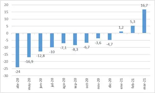 El ISAEER registra una recuperación de la actividad en forma de V a partir de mayo de 2020, tras la flexibilización de las medidas de confinamiento para mitigar el contagio. A partir de enero de 2021 la economía recupera el nivel previo a la irrupción de COVID-19 y cierra el primer trimestre un 7,7% por encima del mismo periodo en el año anterior. Las señales interanuales positivas, sin embargo, deben tomarse con cautela, especialmente porque se compara con el mes de marzo 2020, uno de los más afectado por las medidas de aislamiento social.