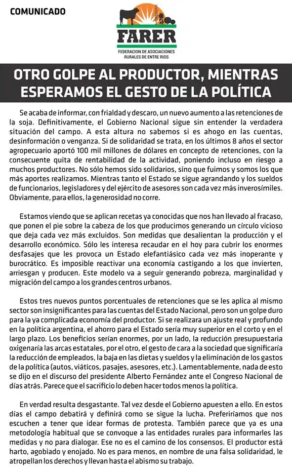 La Federación de Asociaciones Rurales de Entre Ríos (Farer) emitió un comunicado en el que cuestiona las modificaciones a las retenciones que anunció el Gobierno nacional.