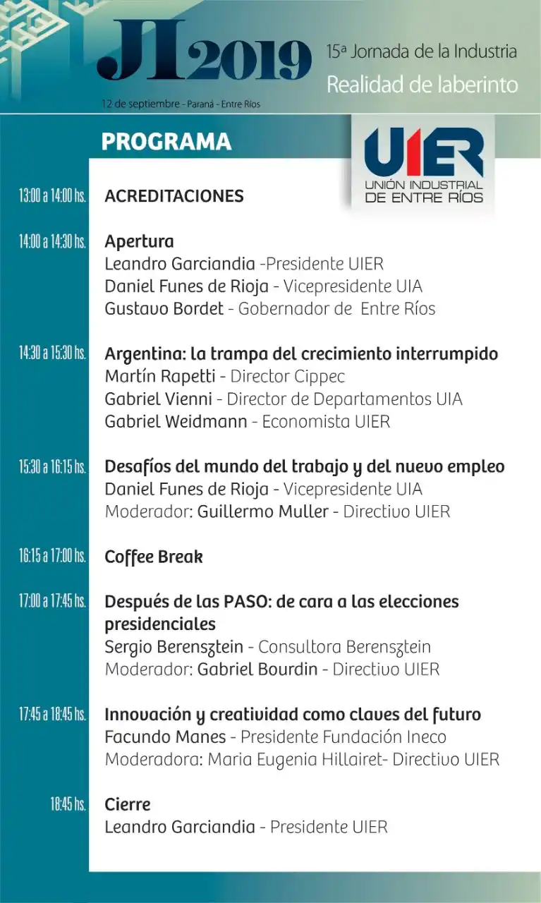El país atraviesa por un escenario crítico, que exige cuanto antes reimpulsar un modelo industrial de crecimiento y desarrollo, que genere valor y empleo de calidad. En este contexto, y ante la necesidad de debatir y sumar nuevas propuestas al Plan Productivo nacional, la Unión Industrial de Entre Ríos (UIER) llevará a cabo la 15ª Jornada la Industria. El encuentro se realizará este 12 de septiembre desde las 13 en el Centro Provincial de Convenciones de Paraná, de la mano de reconocidos disertantes en economía, política, neurociencias y otras perspectivas.