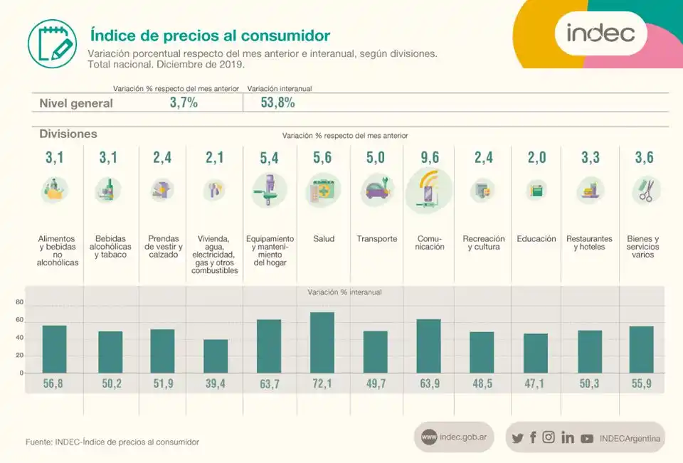 Vale mencionar que a partir de los datos difundidos, en 2019 se registró una suba anual del 53%, la mayor desde 1991 cuando se ubicó en el 84%, impactada por la emisión monetaria, la devaluación del peso y el ajuste de las tarifas.