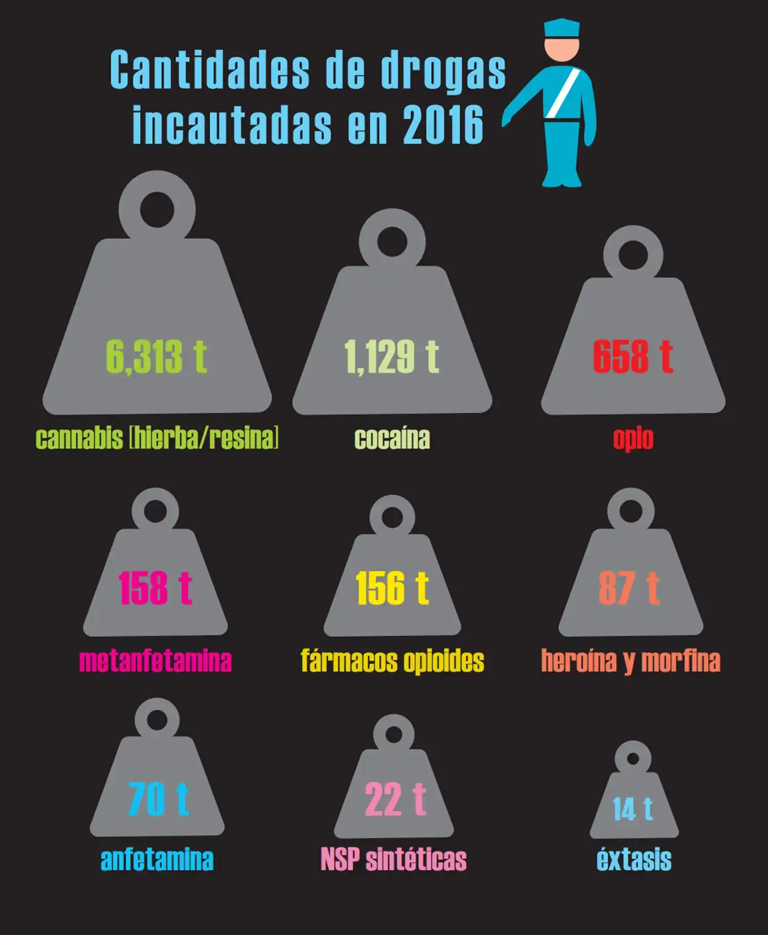La droga más popular es el cannabis, pero la cocaína marca un nuevo récord histórico de producción, con 1.976 toneladas. Las muertes relacionadas con la drogadicción también se incrementaron. Esta y otras siete conclusiones se pueden extraer de esta última investigación en estadísticas.