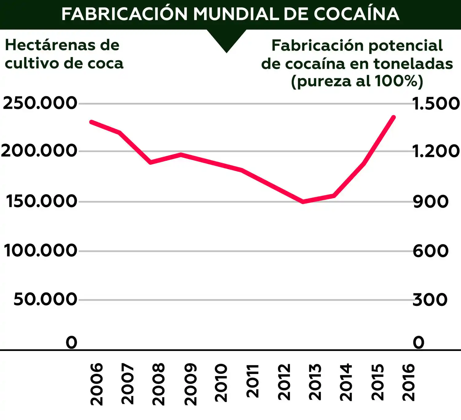 Ni más ni menos que 1.976 toneladas de cocaína se produjeron en el año 2017, un 25 % más que en el anterior registro. También aumentó la cocaína incautada por las fuerzas de seguridad, hasta 1.275 toneladas, la cantidad récord en toda la historia.