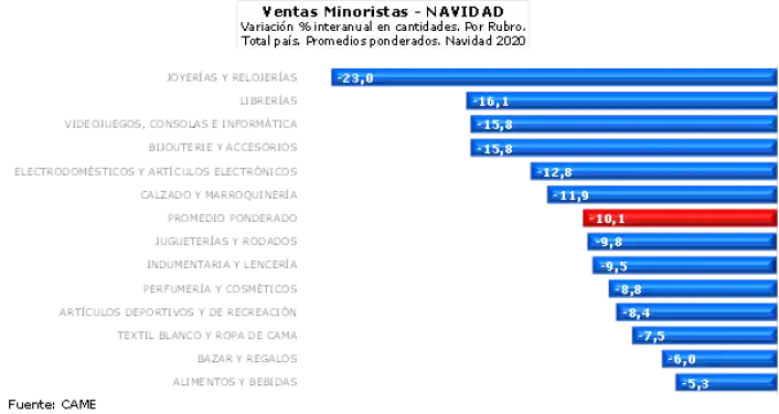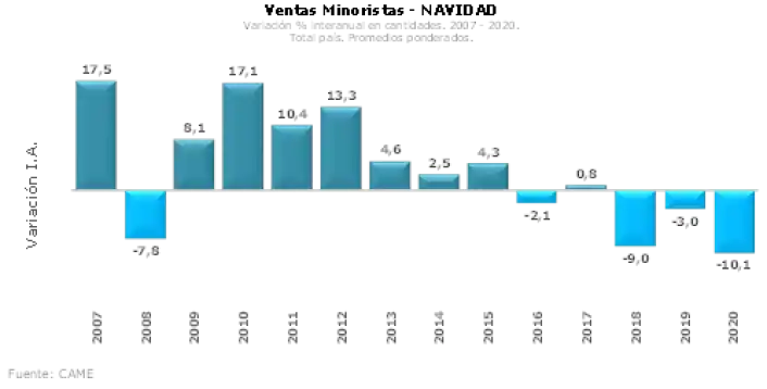 Las ventas por Navidad de los comercios minoristas cayeron 10,1 por ciento en comparación con la misma fecha de 2019, informó la Confederación Argentina de la Mediana Empresa (CAME).