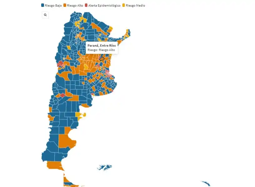 Según el mapa epidemiológico que presentó el presidente, en la provincia de Entre Ríos los departamentos que están en alarma y alto riesgo epidemiológico son: Paraná, Concordia, La Paz, Nogoyá, Villaguay, Colón, Diamante, Gualeguay, Gualeguaychú, Uruguay, Islas del Ibicuy, San Salvador, Federación, Tala.