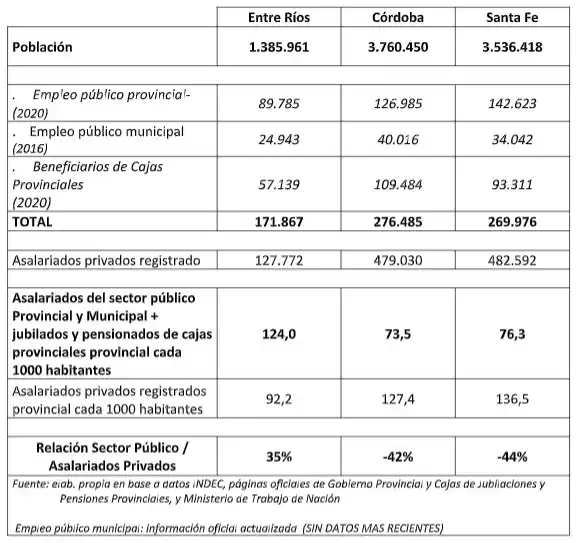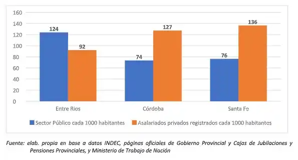 Asimismo, se informa que en el sector privado trabajan 127 mil personas en Entre Ríos, mientras en Córdoba hay 479 mil y Santa Fe 482 mil, según el Ministerio de Trabajo de Nación. Estos datos reflejan que, cada mil habitantes, en Entre Ríos hay 92,2 asalariados registrados privados, cuando en Córdoba hay 127,4 y Santa Fe 136,5.
