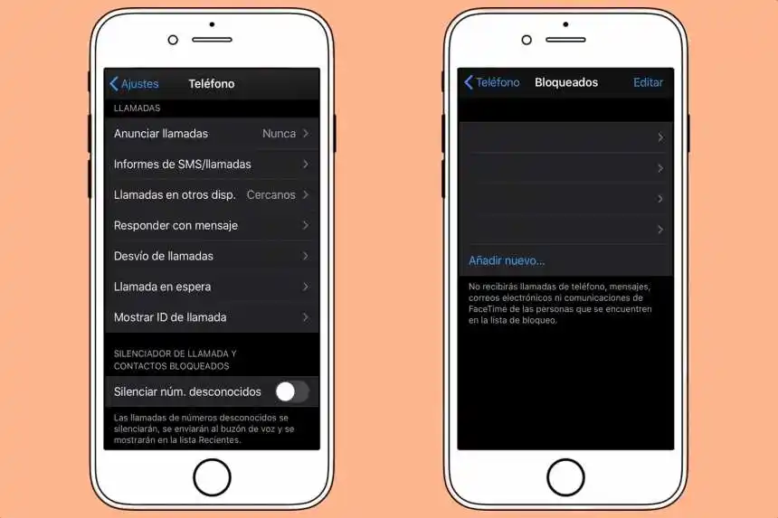 Además, desde Ajustes > Teléfono encontrarás la opción Silenciar números desconocidos. Cuando recibas llamadas de números que no están en tu lista de Contactos, en Mensajes o aparezca en el contenido de tus mensajes de correo electrónico, serán desviados al buzón de voz.