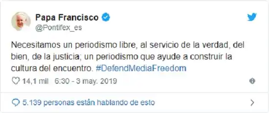 “Necesitamos un periodismo libre, al servicio de la verdad, del bien, de la justicia”, dijo el papa en su cuenta verificada de Twitter.