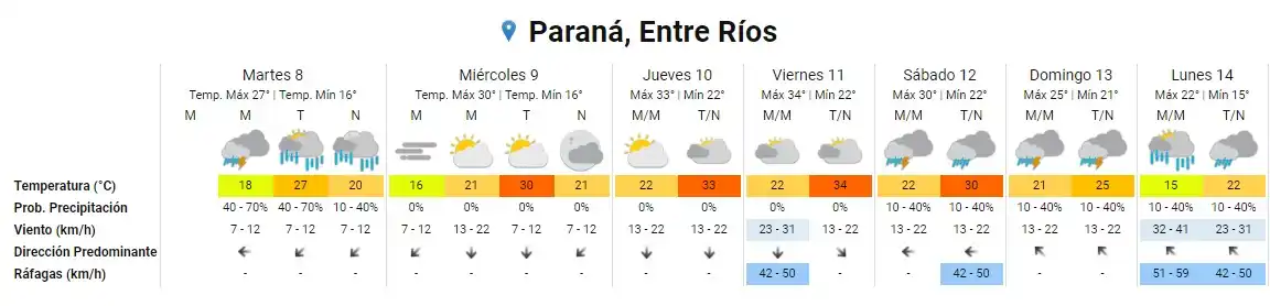 El Servicio Meteorológico Nacional indica para este martes 8 de agosto una temperatura mínima de 18 grados y máxima de 27 grados. Por la mañana se prevén tormentas aisladas, mientras que a lo largo de la tarde y noche se pronostican chaparrones aislados.