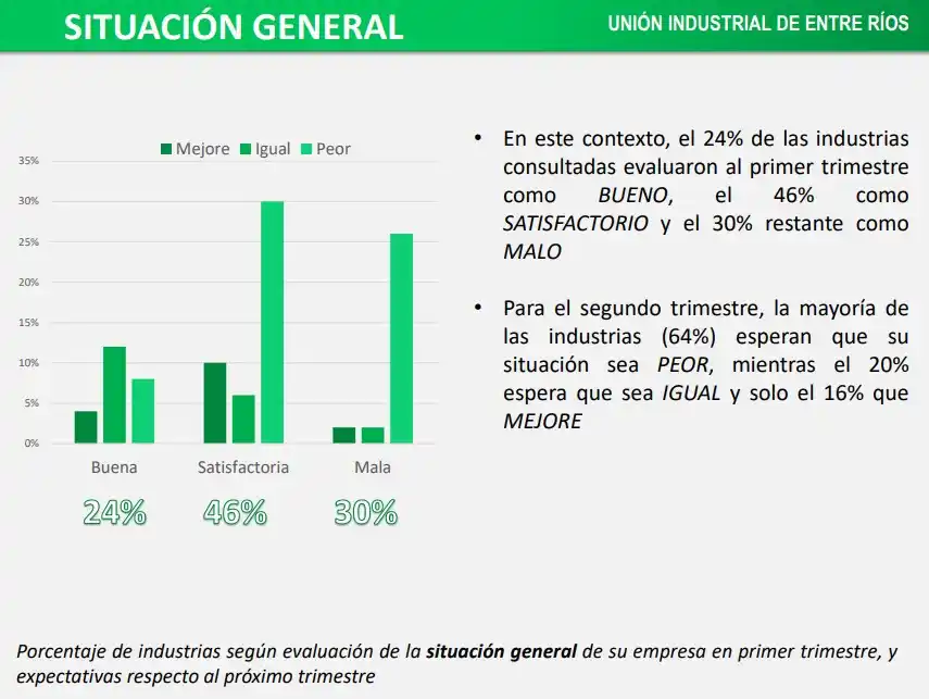 En este contexto, del abanico de industrias provinciales consultadas, el 24% evaluó al primer trimestre como bueno, el 46% como satisfactorio y el 30% restante como malo. De todas maneras, en este escenario, el 64% espera para el segundo trimestre que su situación sea peor, mientras el 20% cree que continuará igual y solo el 16% que mejore.