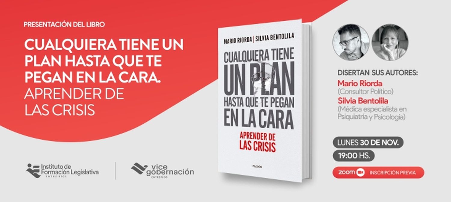 El Instituto de Formación Legislativa de la Vicegobernación de Entre Ríos invita a la presentación del libro “Cualquiera tiene un plan hasta que te pegan en la cara. Aprender de las crisis”, con la participación del consultor político Mario Riorda y la médica psiquiatra del equipo de Emergencia Sanitaria Silvia Bentolila, a desarrollarse el lunes 30 de noviembre a las 19. Se entregará constancia de participación a quien lo requiera.